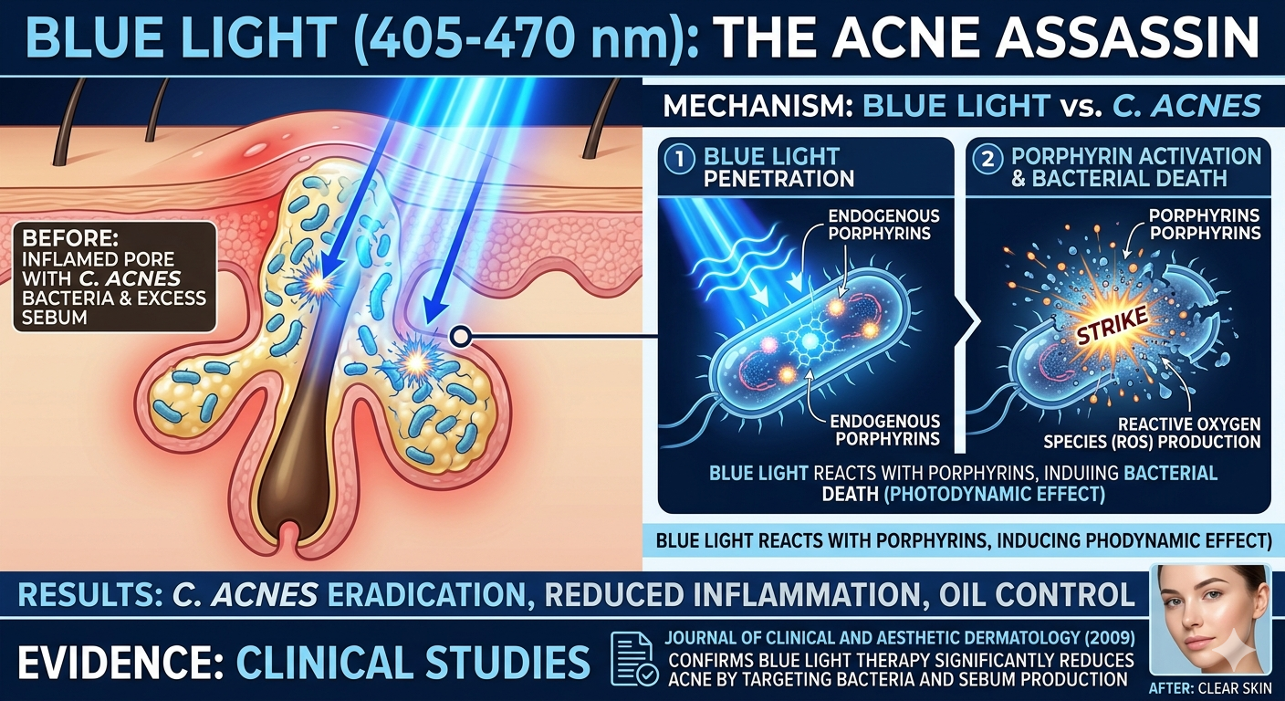 2. แสงสีน้ำเงิน (Blue Light: 405-470 nm) - "เพชฌฆาตสิวอักเสบ"