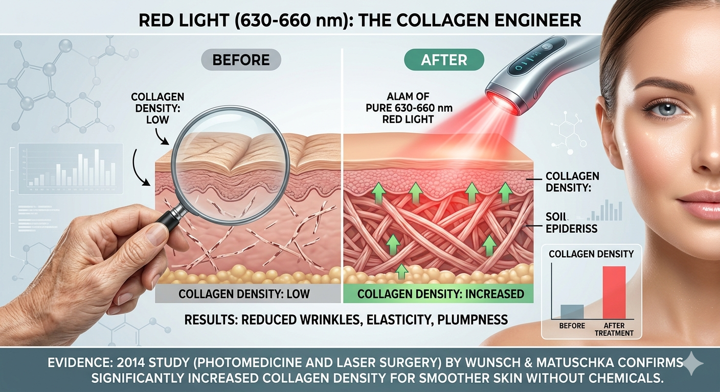 หลักฐาน: งานวิจัยจาก Photomedicine and Laser Surgery (2014) โดย Wunsch และ Matuschka ยืนยันว่าการใช้แสงสีแดงช่วยเพิ่มความหนาแน่นของคอลลาเจน (Collagen Density) ได้อย่างมีนัยสำคัญ ผิวเรียบเนียนขึ้นจริงโดยไม่ต้องใช้สารเคมี