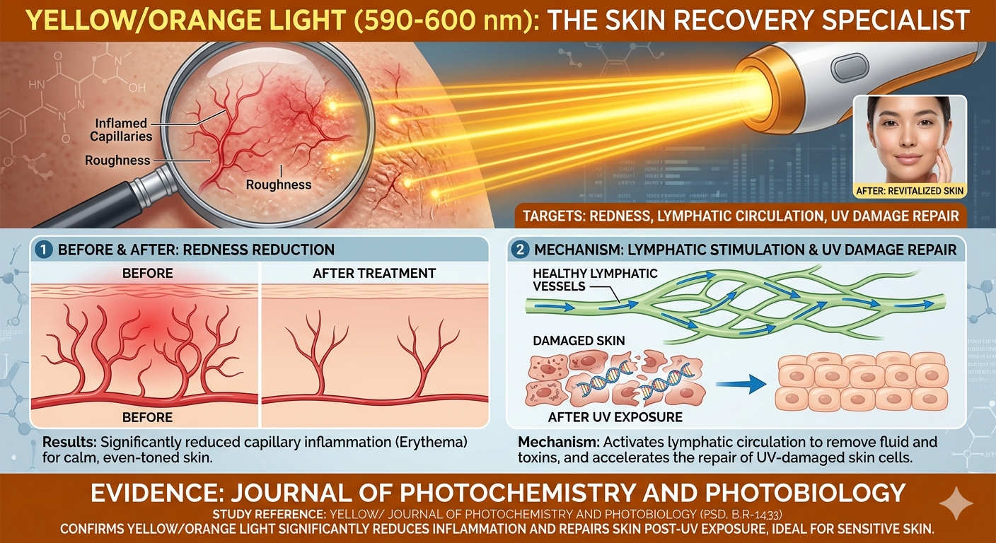 3. แสงสีเหลือง/ส้ม (Yellow/Orange Light: 590-600 nm) - "ตัวช่วยกู้ผิวโทรม"