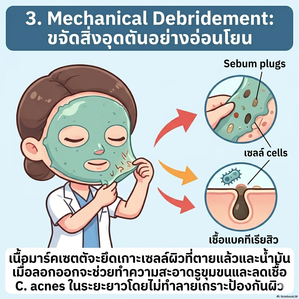 เมื่อเนื้อมาสก์เซตตัว จะเข้ายึดเกาะกับเซลล์ผิวที่ตายแล้ว (Dead Skin Cells) น้ำมันส่วนเกิน (Sebum Plugs) และแบคทีเรีย C. acnes เมื่อลอกออก สิ่งสกปรกเหล่านี้จะหลุดตามมาสก์ออกมาอย่างง่ายดาย โดยไม่ทำลายเกราะป้องกันผิว (Skin Barrier) เหมือนการสครับหน้าทั่วไป