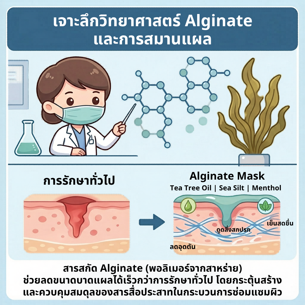 หัวใจหลักของเราคือ Alginate สารสกัดจากสาหร่ายธรรมชาติที่มีงานวิจัยรองรับว่าช่วยสมานแผล (Wound Healing) ได้รวดเร็ว กระตุ้นการสร้างคอลลาเจน และช่วยให้ผิวฟื้นตัวจากการอักเสบได้ดีเยี่ยม ผสานพลังกับ Tea Tree Oil และ Menthol เพื่อความสะอาดสดชื่นขั้นสุด